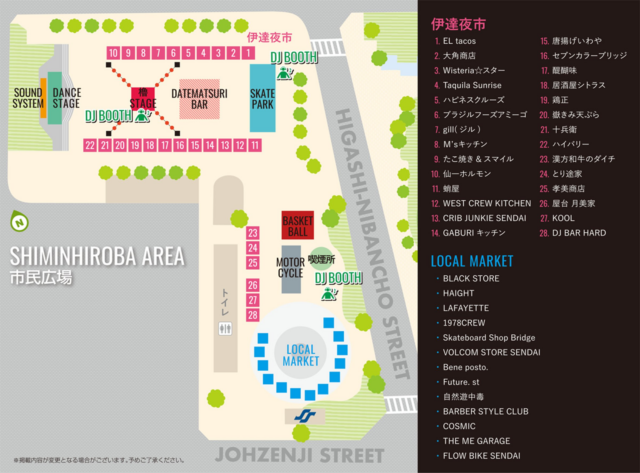 仙台夏の風物詩 伊達祭 気になるイベントをシェア Share on X (Twitter) Share on Facebook Share on Email Share on SMS伊達祭【8/17sat~18sun】伊達祭 2024 -仙台 夏の風物詩-東北最大級のストリートカルチャーフェス「伊達祭」が開催決定!最新情報をこちらのアカウントより発信しますので、フォローしてくださいね♬ pic.twitter.com/0vlX6EIMwM— 【2024 8/17~18】伊達祭【仙台市民広場 / 入場無料】 (@infoDatematsuri) May 10, 2024 日程2024年8月17(土)18(日)伊達祭タイムテーブル会場 勾当台公園市民広場 入場料無料主催伊達祭実行委員会公式サイト詳細は公式サイトを御覧ください。👇 👇 👇※イベント内容・スケジュールが変更される場合もあります。気になるイベントをシェア Share on X (Twitter) Share on Facebook Share on Email Share on SMS